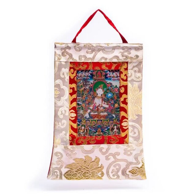 Seina peale riputatavad thankad on pildid valgustunud olenditest ning väravad jumaliku energia juurde Tiibeti traditsioonis, mis tõstavad ruumide sagedust ning aitavad keskenduda kõrgematele ja puhtamatele energiatele. Traditsioonilise brokaadist raamiga.